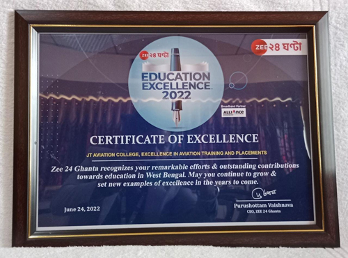 JT Aviation College is elated and deeply honored to have been awarded the prestigious "Education Excellence Award 2023" for our outstanding contributions to aviation training and placement. This distinguished accolade was presented to us by the esteemed organization, Zee 24 Ghanta, further cementing our commitment to excellence in aviation education. Receiving the "Education Excellence Award 2023" is a testament to the unwavering dedication of our college in shaping the future of aviation professionals. It reflects our tireless efforts in providing top-notch training and placement services, equipping our students with the skills and knowledge needed to excel in the dynamic aviation industry.