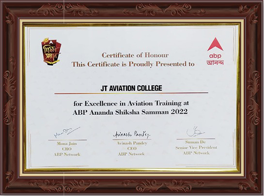 JT Aviation College is elated and deeply honored to have been awarded the prestigious "Education Excellence Award 2023" for our outstanding contributions to aviation training and placement. This distinguished accolade was presented to us by the esteemed organization, Zee 24 Ghanta, further cementing our commitment to excellence in aviation education. Receiving the "Education Excellence Award 2023" is a testament to the unwavering dedication of our college in shaping the future of aviation professionals. It reflects our tireless efforts in providing top-notch training and placement services, equipping our students with the skills and knowledge needed to excel in the dynamic aviation industry.